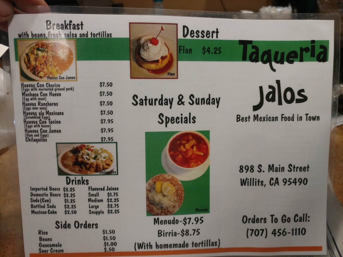 Welcome to Taqueria Jalos, a culinary gem nestled at 898 S Main St, Willits, CA. This authentic Mexican eatery offers a delightful array of dishes that promise to tantalize your taste buds. Their fajitas, featuring succulent prawn, steak, and chicken, are grilled to perfection alongside vibrant bell peppers and onions, all served at prices starting from $17.99. Don’t miss the notable tacos and burritos, loaded with flavorful meats like carne asada and carnitas, renowned for their rich taste and generous portions.